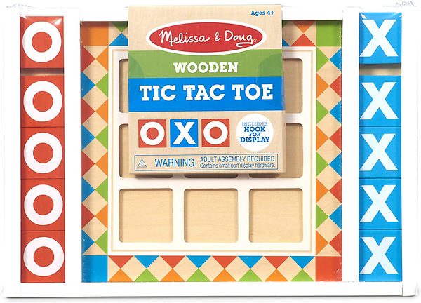 Includes white-framed wooden board with indented squares for mess-free play, 10 colored x and O game tiles, hanging hardware, Detailed game instructions, and challenging variations