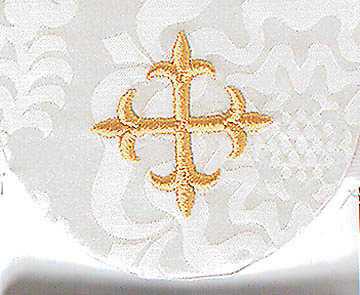 This white Usher Pocket Badge features a cross embroidered in gold on Bemberg Damask, and a stiff card back that allows badge to slide easily into your pocket.