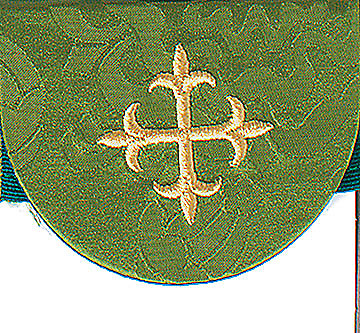 This green Usher Pocket Badge features a cross embroidered in gold on Bemberg Damask, and a stiff card back that allows badge to slide easily into your pocket.