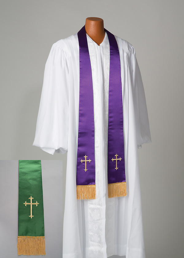 The quality, versatility, and value of this long-wearing satin reversible Purple/Green Stole make it one of our most popular stoles. This stole features beautiful gold embroidery of a latin cross symbol and a gold-fringed edge. 92" long, 4 1/2" wide; tapers to 1 3/4" at the neck.