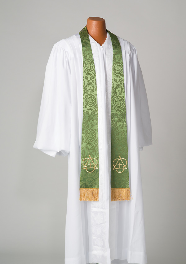 This stole features a Trinity embroidered symbol. It is manufactured in bemberg damask in the tudor rose pattern with a matching satin lining and is finished with gold fringe. In a traditional tapered style 90” length 4” width at the bottom.