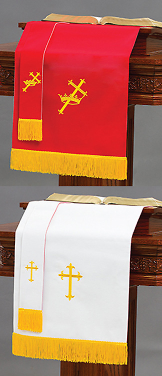 Economically priced, this handsome reversible Red/White Bookmark and Pulpit Scarf Set offers excellent construction; each piece will retain its shape and beauty for years to come--features machine embroidered gold-colored symbols on 100% polyester polyfaille, strengthened with interlining, and is finished with gold-colored fringe. The red side features a Cross and Crown design; the white side features a Latin Cross design. Each piece is finished with a chainette gold fringe. Made in the USA.