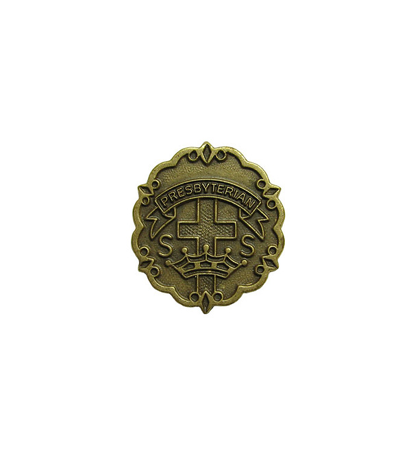 Recognize your student for perfect attendance with this attractive 3-Month Attendance Pin. It features a bronze finish. The cross and crown symbol appears with the cross in red and a silver outlined crown. An “S” is placed on either side. The word “PRESBYTERIAN” appears above the symbol in a blue banner. It has a pin-back attachment and safety catch.