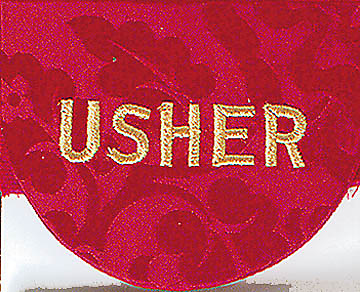 This red Usher Pocket Badge features the word “Usher” embroidered in gold on Bemberg Damask, and a stiff card back that allows badge to slide easily into your pocket.