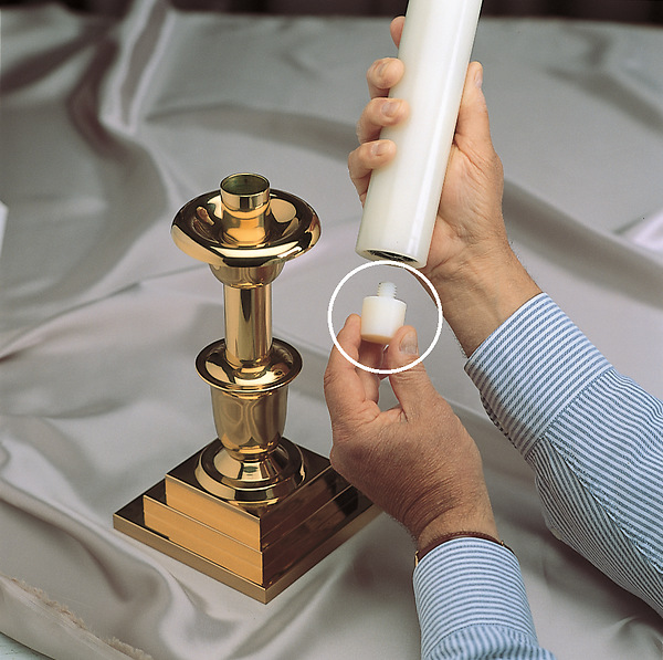 Attach adaptor by inserting into base of candela, then simply insert candela into socket of your candle holder. 1" x J".