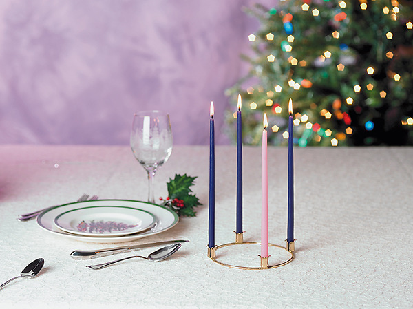 This handsome, table-top brass finish 6" wreath (ring) can be used with or without evergreen trim. Wreath has four, extra-deep, decorative holders; includes eight 10" x 7/16" taper candles (6 purple, 2 pink).