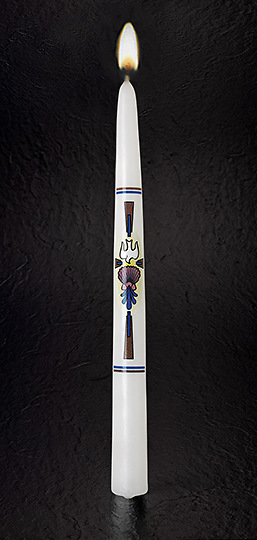 White 9" x 11/16" Child of God Baptism Candle is finely decorated, featuring shell and dove. Boxed. Available for automatic shipment.