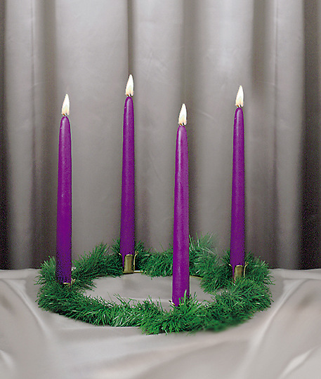This simple, yet attractive Advent Wreath with Candles and Greenery includes evergreen trim, fixture, instruction leaflet, and 4 Purple candles (10" x 7/8").