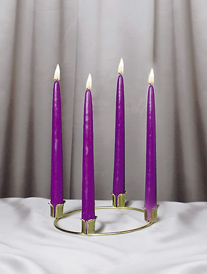 This handsome, table-top brass finish 7" wreath can be used with or without evergreen trim. Wreath has four, extra-deep, decorative holders for standard 7/8" tapered candles; includes four 10" x 7/8" purple candles.
