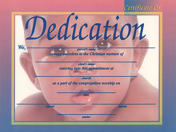 A package of 6 flat certificates (8 1/2" x 11") for dedication of an African American child printed in 4-color on quality card stock. Space for parents' names, child's name, church name, date, and pastor's and parents' signatures. No Scripture is printed on the certificates. A free online template for this certificate is available at www.bhpublishinggroup.com.