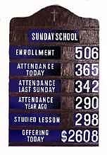 This Register Board is made of durable dark oak - laminated and finished - on both sides of 3/4" chipboard. The routed cross at the top is painted in gold gilding. Slides included: Sunday School, Enrollment (2), Attendance Today (2), Attending Worship, Discipleship Training, Attendance Last Sunday, Offering Last Sunday, Attendance Year Ago, Record Attendance, Prepared Lesson, Brought Bible, Outreach Contacts, Ministry Contacts, Total Contacts, Building Fund, Offering Today, Offering Year Ago, Set of numerals 0-9 (6), Arrows (6), Decimals (6), and Dollar Marks (6). Overall size is 18" x 28”. Shipping weight: 12 lbs.