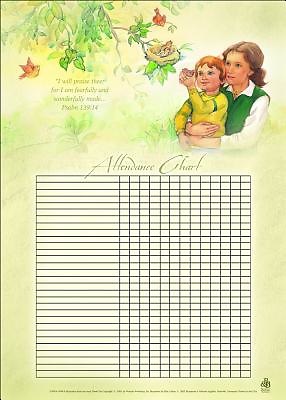 Attendance charts (20" x 28") are a wonderful classroom resource for many different church groups and organizations. These colorful and fun charts will brighten up any classroom. The beautiful art has "kid appeal" and the low cost will enable every class to have one. Each chart has space to list 30 names and record attendance for 13 weeks. It features Psalm 139:14 (KJV) Scripture.