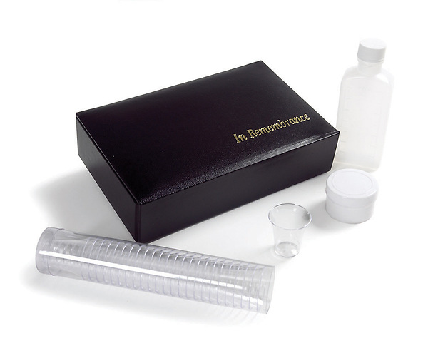 Black portable communion set contains 25 disposable cups in a reusable plastic sleeve, a plastic container for juice, and a plastic container/server for communion bread. Made of heavy-duty cardboard, the box is wrapped in a leather-look paper with padded cover and magnetic closure; juice and bread not included; replacement bottle and bread holder available.