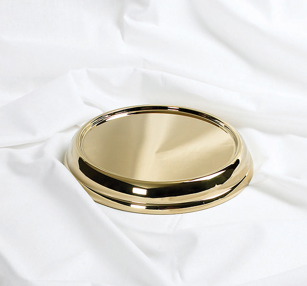 RemembranceWare® Traditional, brass-colored stainless steel communion Stacking Bread Plate Base is made of the same high-end, food grade stainless steel as are all RemembranceWare® pieces. It achieves it’s unique brass hue through a multi-step finishing process. This is the base which the Stacking Bread Plates rest upon. It gives support and creates a dramatic foundation for the stacked Plates The Base is standard size (1 1/8" high and has a diameter of 8 1/4"). Edges are double rounded to ensure a smooth and safe feel to this piece. RemembranceWare® pieces are easily cleaned with mild soap and water and a soft cloth. This piece carries a 5-Year Guarantee and is beautifully boxed.