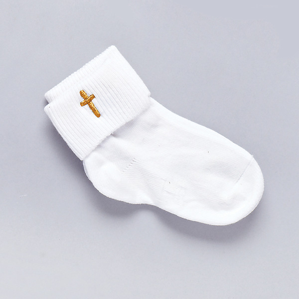 These socks are a great gift for a baby's baptism. Embroidered on the ankle is a bold golden cross.
