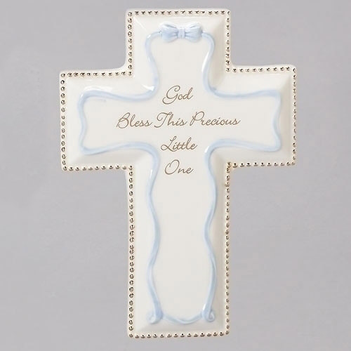 "God Bless This Precious Little One" Baptism Porcelain Wall Cross - Blue and white with gold accent. 6.25"H x 4.5"W.