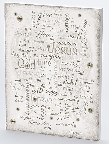 This puzzle like jeweled wall plaque features the words from The Serenity Prayer, is printed on medium density fiberboard and measures 16"H x 11".