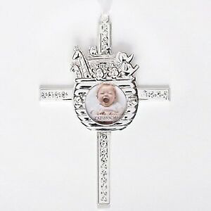 Noah's Ark Cross with picture frame by Roman Caroline Collections. Approximately 8 inches tall, holds 2" x 2" photo. Ark Photo Fame attaches with magnets. Shinny sliver tone zinc alloy - lead free, crystal rhinestones embellishments.