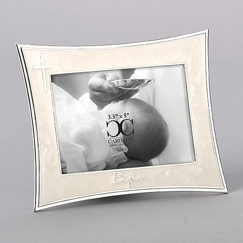 Classically beautiful ivory with silver cross Baptism photo frame, measures 5.5 x 6.75 inches in size. Holds 3.5 x 5 inch photo. Gift Boxed.