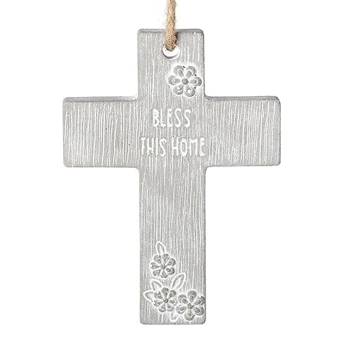 This cement cross features raised flowers and engraved words Bless This Home Cross, measures 4".