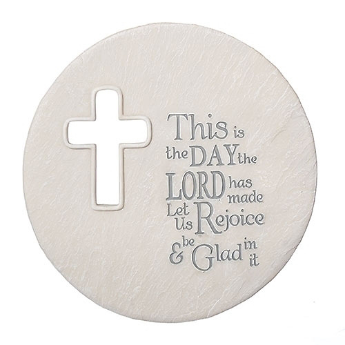 This is the Day round table plaque with easel is resin/stone mix and is 8.75" H and comes with a white cross and the inscription, 'This is the day the Lord has made , Let us rejoice and be glad in it.