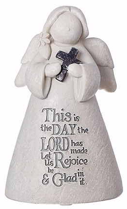 The figurine is made of a resin and stone mix, measures3-1/2" H. The angel holds a silver across and has the words from Psalm 118:24 which reads "This is the day the Lord has made, Let us be glad and rejoice in it" written across the front of the gown. She comes in an attractive gift box.