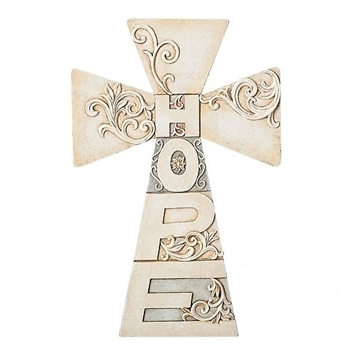 This is a beautiful cream and gray resin wall cross that features the word HOPE cascading down and accented by a flowery scroll design, and measures 8.75"H