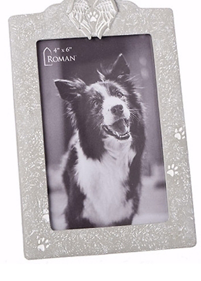 Pet memorial resin photo frame features paw prints and Angel wings. Frame is 7.5"H, holds 4X6' photo.