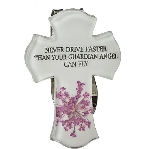 Never Drive Faster Than Your Guardian Angel Can Fly visor clip features a Cross with a star burst of purple flowers and the phrase 'Never drive faster than your guardian angel can fly' Give as a gift and gentle reminder to slow down. Resin and 2"H.
