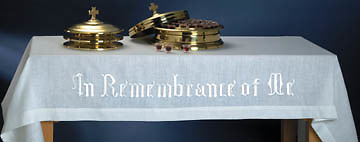 Adding grace and style to your Communion Sunday or other religious occasion, this 100% pure linen Table Cover is adorned with beautiful embroidery and detailing; featuring “In Remembrance of Me” embroidered across the front. 2” machine-sewn hems and mitered corners; 12” drop on each side. 50” x 80”. Made in the USA.
