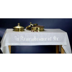 Adding grace and style to your Communion Sunday or other religious occasion, this 100% pure linen Table Cover is adorned with beautiful embroidery and detailing; featuring “In Remembrance of Me” embroidered across the front. 2” machine-sewn hems and mitered corners; 12” drop on each side. 50” x 86”. Made in the USA.