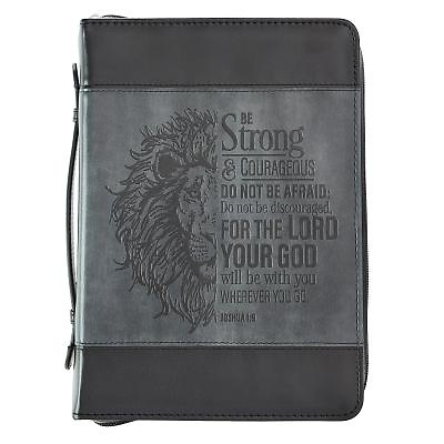 Scripture Bible Case: This handsome two-tone case features heat-debossed Scripture sentiment from Joshua 1:9 in bold lettering accompanied by the striking half image of a lion's face: "Be strong and courageous. Do not be afraid. Do not be discouraged. For the the Lord your God will be with you wherever you go.