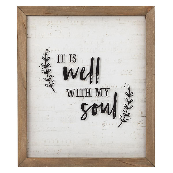 plaque be a reminder of God's constant love and care. Display it in a place where it can be of comfort for those who mourn or those who need reassurance. Black wording in contemporary lettering is accentuated with natural plant sprig designs. The wording is printed on the inside of the glass and contrasted against a faded sheet music background - creating a three-dimensional effect. The glass is framed by a weathered wood and measures 14" (L) x 12” (H) x 1" (D) (356 x 306 x 25 mm). Hooks are included for hanging purposes.