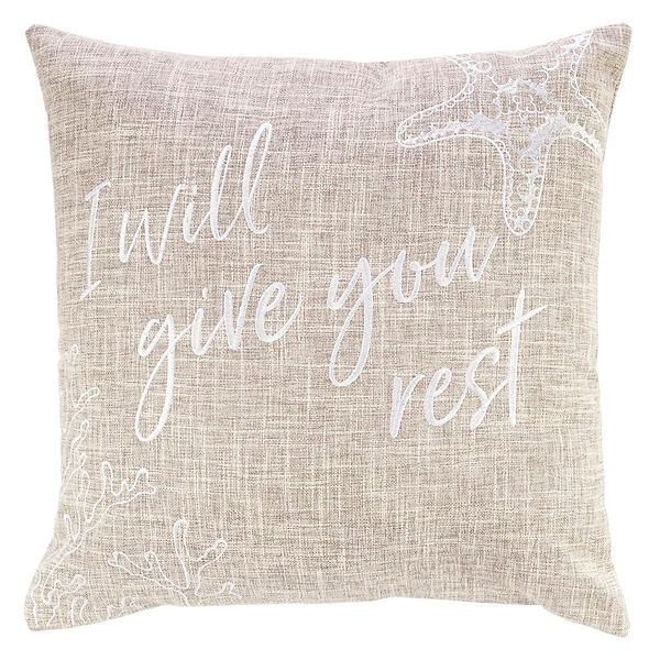 “Come to Me, all you who are weary and burdened, and I will give you rest.” Matthew 11:28 Resting in the Lord can become a practical reality as you repose against this I Will Give You Rest pillow. The Scripture promise from Matthew 11:28, “I will give you rest,” adorns the front of the pillow, framed by images of a starfish and coral limbs. The tan, linen-look fabric may even remind you of the color of cool, wet sand on a sunny beach day! With 100% polyester fill, this is pure comfort—sturdy yet soft, a generous 18” x 18”! It blends with any décor and is especially attractive when combined with the deep-sea blue of the companion I Will Give You Rest pillow (sold separately). Use in a living room, sun room, or enclosed porch since this is not water-resistant. No matter how far you live from the coast, this pillow will make ocean breezes seem close to home!