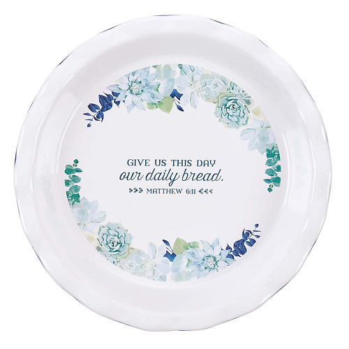 The Our Daily Bread 9.5-inch Pie Plate is designed with a prayer in mind. Give us this day our daily bread, is taken from the Lord's Prayer recorded in Matthew 6:11 and brings praise to the One who provides all things. Pie Plate Dimensions: 9.5 Inch