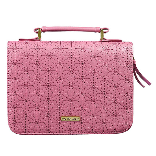 Scripture Bible Case: This stylish dusty rose case features the sentiment, “Grace” engraved on a gold metal badge. A repeating star pattern is stitched onto the front and back covers.