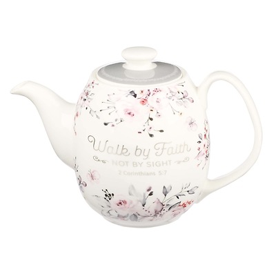 PINK/PURPLE FLOWER TEAPOT: Don’t be fooled, the Walk By Faith Scripture tea pot is not only a decorative teapot, it is functional and a perfect ceramic teapot for hot tea. The inspirational teapot features beautiful pink, purple and gray floral design with metallic silver lettering on a white background with a gray lid.