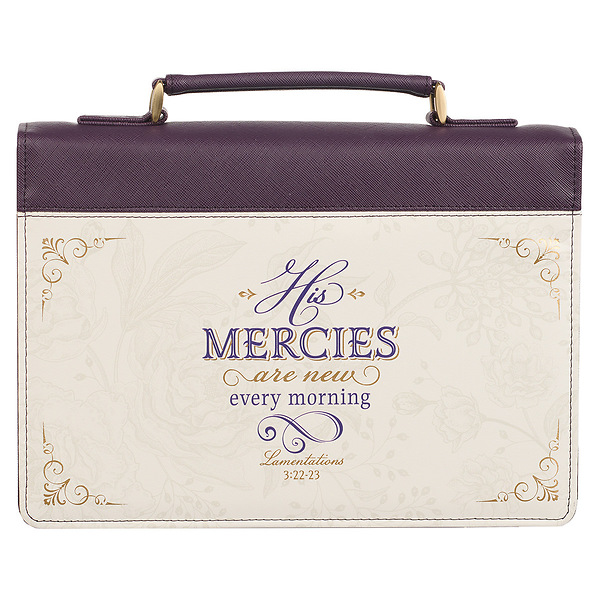 Rejoice in the never ending supply of God's mercy every time you open the His Mercies Are New Dark Amethyst Purple Fashion Bible Cover to read your Bible. Let the message of this gorgeous Bible case nourish your heart and soul while its sturdy faux leather construction protects your Bible from the wear and tear of loving use.