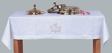 Adding grace and style to your Communion Sunday or other religious occasion with this communion table cover with embroidered IHS symbol.