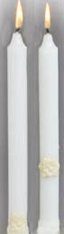 These beautifully decorated side candles from the Holy Matrimony Set are a perfect choice for that special day as a couple begins their life together—pair, 7/8” x 10 1/4” side candles. These candles are encased in a decorated plastic bag to keep them in ideal condition. Center candle is sold separately.