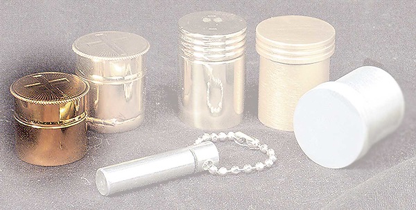 Balms (sold separately). The Stock features threaded lids and rubber seals to prevent leakage, and an etched engraving of a cross. The size is 1 1/8” high and 1” in diameter. 24K Gold Plated.