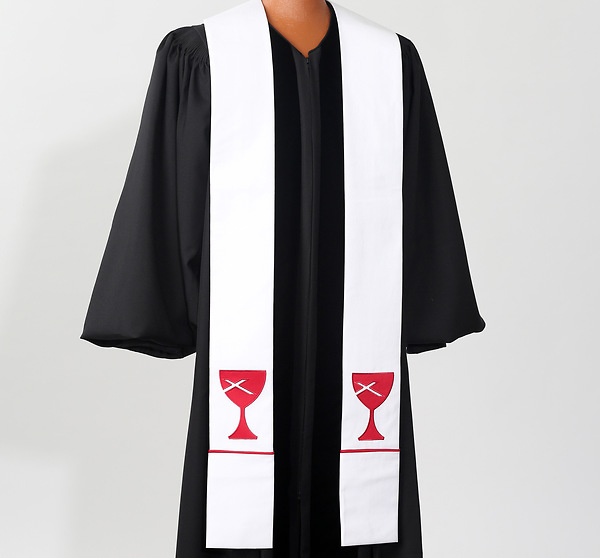 Represent your faith with dignity and grace with our Disciples of Christ White Stole! Made from quality kodel polyester and cotton fibers, this luxurious white stole features a stylish red braid at the bottom and an intricately appliquéd red chalice. For maximum comfort, an adjustable chain is included that holds the stole away from your neck. This expertly crafted stole is lined for body and stability, and its one-seam construction offers pucker-free edges every time! The size is 5" wide by 100" long, making it a simple yet bold statement of faith. Order your Disciples of Christ White Stole today – also make a great gift for someone special!