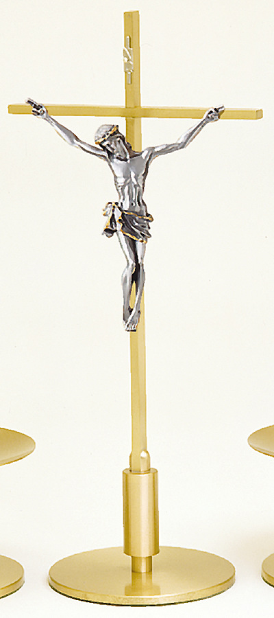 This altar crucifix is brass with satin finish and has an oxidized silver corpus. Stands 15"H., and has a 5" base.
