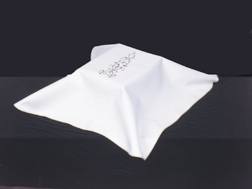 Designed for ash urns. Made of imported white Lurex fabric. Edged with gold cord and embroidered with religious symbol called "