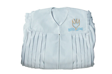 This Candidates’ Baptismal Gown prepack features five adult robes (one small, two medium, and two large); each robe has an embroidered baptism symbol of a descending dove in blue and gold on the left chest.