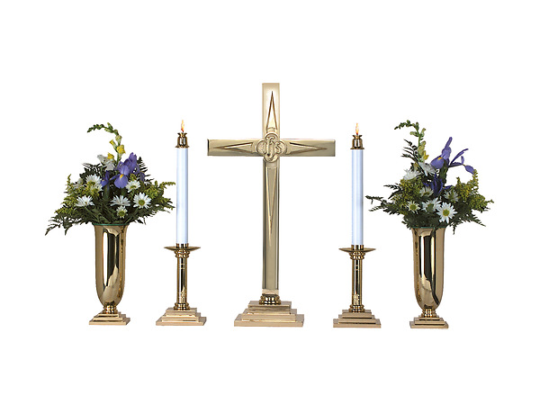 The set includes the traditional Latin cross with an overlaid star cross highlighting the IHS medallion at the intersection of the cross arms. The Cross’ square base measures 8” x 5 1/2". Coordinated pair of 10” candlesticks and a pair of 11 1/4" vases are included to make this an appropriate grouping for any worship setting; each piece features a three-step base.