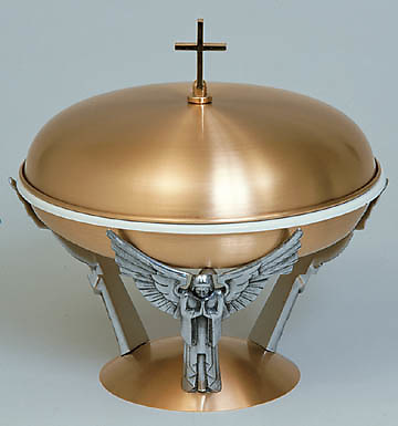 This beautiful baptismal bowl comes in a bronze satin finish and is ornate with three angels in oxidized silver. It measures 14-1/2" in diameter with a 8" base. It is completed with a cross topped lid.