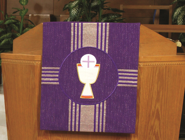 As part of the Kingdom Cross Parament Series, this attractive purple pulpit scarf with the symbol of chalice and wafer is crafted of fine imported English wool, highlighted with distinctive silk and metallic thread embroidery and complementary cording. Made in the USA. The pulpit scarf measures 20” x 42”, including a 20” front drop. It can be custom ordered to fit your pulpit/lectern.