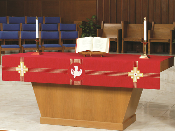Add elegance to any worship setting with our attractive Red Altar Frontal crafted of fine imported English wool, highlighted with distinctive silk and metallic thread embroidery and complementary cording. Depicted on either end is the symbol of the cross, with the manger in the center. This Altar Frontal is part of a Parament set made to exclusively fit your Altar Table, making it a custom item requiring the specific measurements of your Altar. At this time we are unable to process custom orders online, but you may still order your Paraments by contacting our Custom Sales Unit, 1-800-237-7511. One of our representatives will be more than happy to assist you with ordering. Please allow 4-6 weeks for delivery.