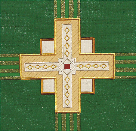 As part of the Kingdom Cross Parament Series, this attractive Green Pulpit/Lectern Scarf with the symbol of the cross is crafted of fine imported English wool, highlighted with distinctive silk and metallic thread embroidery and complementary cording. Choose this symbol of the cross or the symbol of the trinity to match the symbol on your table runner or altar frontal. The Pulpit/Lectern Scarf measures 20” x 42”, including 20” drop, but can be custom ordered to fit your pulpit/lectern.